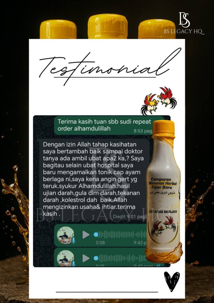 “Alhamdulillah selepas amalkan tonik ayam berlaga ni kencing manis saya dapat bacaan normal dan darah tinggi saya pon makin okay”